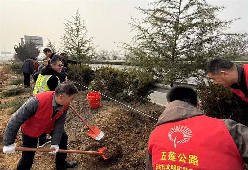 3月12日,正值植树节,董梁高速一标段项目部联合五莲县公路事业发展中心,在叩官镇G342国道旁开展“党旗领航植新绿 合力共建筑新景”植树活动。
